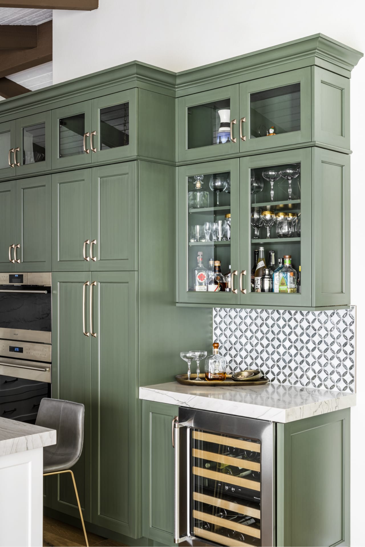 Simultaneously, Chantel started with the design angle using a bold color on their cabinetry: green. The rich tone pushed the space further, and complements the newly added wood beams and intensely patterned wallpaper.